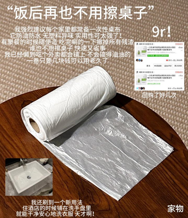 最后就是这种一次性的防油桌布啦,真的超好用,逢年过节家里聚餐吃饭的时候铺上它,能避免因为油污过多导致的桌面清洁不便,平日里偶尔懒得收桌子,也可以铺上它吃饭,又没有异味又能防油抗污。