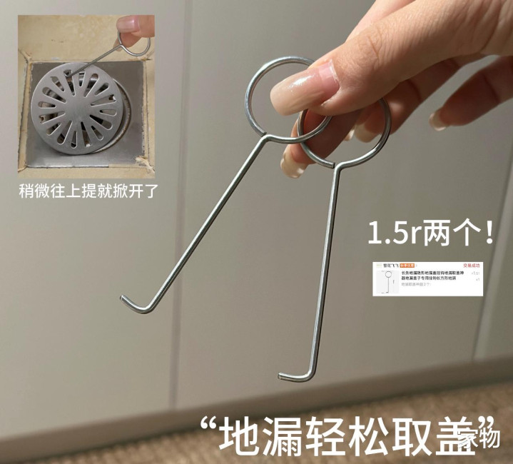 地漏清洁,每次我最烦的就是抠那个地漏盖,以前都是直接用一次性筷子撬,但很不顺手,后来老妈直接在拼夕夕买了俩这种地漏盖钩子,每次清洁的时候取地漏盖轻松多了,好用,爱用。