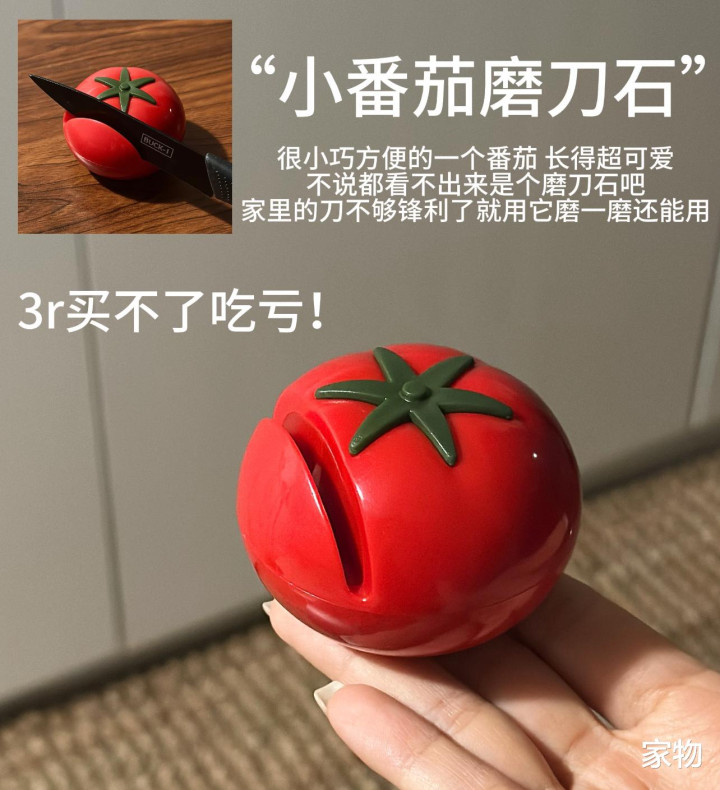 再有就是这种磨刀石,它是个小小的番茄造型,平日里不用的时候可以就这么放在橱柜台面上,看上去就是个小小的装饰品。