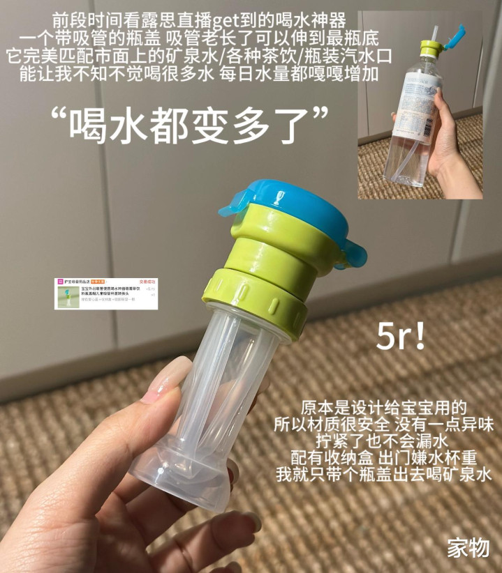 拧下矿泉水自带的盖子,将它旋拧上去,就可以直接把普通的瓶装矿泉水变成吸管式,不仅喝起来更方便更有趣,又能在无形间增加我的饮水量,想想还真是一举两得呢。