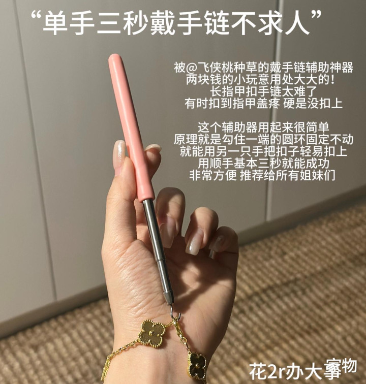 好在有这种带手链辅助器,一边钩住手链的挂环,另一只手可以轻松扣上,真的特别省事儿,推荐给各位喜欢手链的小伙伴试试。